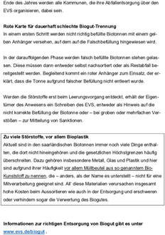 Werden die Störstoffe erst beim Leerungsvorgang entdeckt, erhält der Eigentümer des Anwesens ein Schreiben des EVS, entweder als Hinweis auf die nicht korrekte Befüllung der Biotonne oder – bei groben oder mehrfachen Verstößen – zur Mitteilung von Sanktionen.