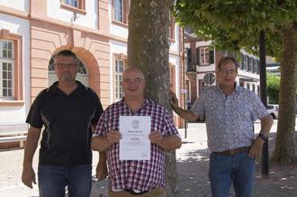 Ralf Schetting vor dem Rathaus am Paradeplatz, umrahmt von Bürgermeister Bernd Hertzler (rechts) und Baubetriebshof-Leiter Axel Ruth