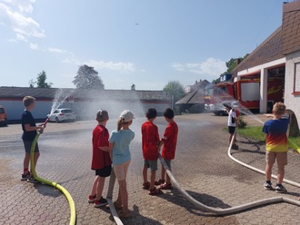Zum Abschluss des Tages luden die hohen Temperaturen zur Nassübung ein, um sich abzukühlen. Die Kinder rollten die Schläuche aus und dann hieß es „Wasser marsch!“. Klitschnass, aber glücklich verabschiedeten sich die Kinder dann nach einem spannenden Tag bei der Feuerwehr.