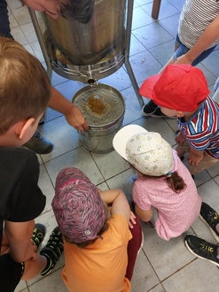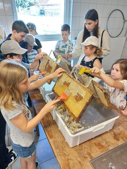 Nach dem Besuch des Bienenstocks durften die Kinder „fleißig wie die Bienen“ geerntete Honigwaben öffnen und schleudern. Der frisch geschleuderte Honig durfte im Anschluss natürlich verkostet werden.