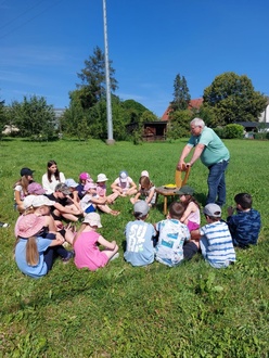 Dabei tauchten immer wieder viele Fragen auf: Wie viele Bienen leben in einem Volk? Warum produzieren sie den Honig? Machen Bienen Winterschlaf? Wie heißt die männliche Biene? Und woran erkenne ich eigentlich die Königin? Gemeinsam wurden all diese Fragen beantwortet. Wer sich traute, durfte sogar mit Imkerhut ganz nah an die Bienen heran. Auch durften die Bienen ganz zart gestreichelt werden.
