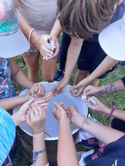 Erst vor kurzem war der Schafscherer am Hof und verpasste den Schafen ihre Sommerfrisur. Aufgabe der Kinder war es, im Rahmen der Wollwerkstatt die Wolle der Schafe zu waschen und zu kämmen. Das Kämmen erfolgte mithilfe einer Trommelkardiermaschine. Hier wurde die naturfarbene Schafswolle auch durch eingefärbte Wolle ergänzt, was später schöne bunte Ergebnisse beim Filzen zauberte. Eva zeigte den Kindern am Spinnrad, wie man aus der Schafswolle einen Faden spinnt, welcher zu Freundschaftsarmbändern wurde.
