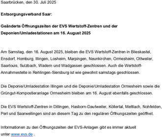 Saarbrücken, den 30. Juli 2025. Am Samstag, den 16. August 2025, bleiben die EVS Wertstoff-Zentren in Blieskastel, Ensdorf, Homburg, Illingen, Losheim, Marpingen, Neunkirchen, Ormesheim, Ottweiler, Saarlouis, Sulzbach, Wadern und Wadgassen geschlossen. Auch die Wertstoff-Annahmestelle in Rehlingen-Siersburg ist wie gewohnt samstags geschlossen.