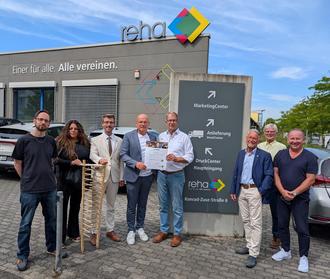 Von links nach rechts: Thomas Zimmer, Carmen Geraci, Verwaltungsdirektor Jens Welsch, Reha-Geschäftsführer Thomas Vogelgesang, Bürgermeister Bernd Hertzler, Beigeordneter Guido Freidinger, Wolfgang Giffel und Reha-Betriebsleiter Michael Lessel.