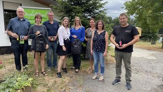Trafen sich zur Rucksack-Übergabe der Commerzbank mit Ölverkostung bei der Bliesgau-Öl- und Senfmühle Berghof in Einöd: Dr. Gerhard Mörsch (Geschäftsführer Biosphärenzweckverband), Umweltpraktikantin Anni Meierfels, Bürgermeister Frank John (stellvertretender Verbandsvorsteher), Umweltpraktikantin Lara Sprenger, Susan Eberle (Marktbereichsleiterin Commerzbank), Stefanie Lagaly (Biosphärenzweckverband), Marliese und Hans Pick (beide Bliesgau-Öl- und Senfmühle)