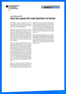 Inzwischen hat das Bundesministerium für Wirtschaft und Klimaschutz (BMWK) entsprechende neue Materialien veröffentlicht, die auf dessen Homepage eingesehen oder heruntergeladen werden können. Darunter finden sich diverse Informationspakete - quasi alles, was man benötigt, um bei der Kampagne mitzumachen. Beispielsweise die Infopakete "Wir sind dabei" und "Unterstützerinnen und Unterstützer - Jeder Beitrag zählt", des Weiteren Social Media-Vorlagen, Material für Webseiten, Banner und Textvorlagen, Energiespartipps für Haushalte und Arbeitsplatz und mehr.