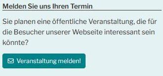 Einfach im farbig unterlegten Feld unten auf „Veranstaltung melden“ klicken und die zur Veröffentlichung gewünschten Informationen eingeben. Sie benötigen dazu keinen separaten Zugang. Nach Übermittlung Ihrer Daten erhält das Kulturamt eine Info über die neu gemeldete Veranstaltung, prüft diese und schaltet sie frei.