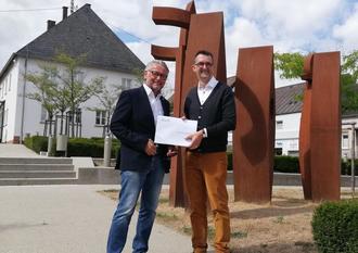 Der Beigeordnete Guido Freidinger sichtlich erfreut bei der Bescheid-Übergabe durch den saarländischen Innenminister Reinhold Jost (rechts im Bild).
