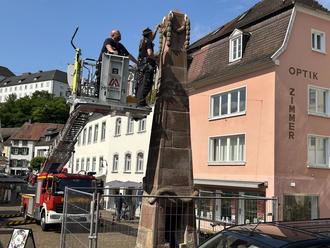 Die beauftragte Fachfirma erledigte die höher gelegenen Sanierungsarbeiten am Schlangenbrunnen mit Hilfe der Drehleiter. (Foto: Stadt Blieskastel)