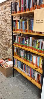 Damit die neuen Bücher auch einen schönen Platz bekommen, hat das Team in den Ferien ältere Bücher aussortiert. Diese stehen auf einem Regal im Flur und freuen sich auf ein neues Zuhause.