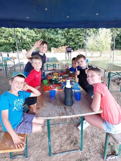 Am Vormittag von Tag drei wurden die Tiere auf dem Hof versorgt und die Kühe gemolken. Um den sommerlichen Temperaturen zu entfliehen, wanderte die Gruppe am Nachmittag an den Ommersheimer Weiher. Dort hatten die Kinder die Möglichkeit, das Tretbecken zu nutzen, auf dem Spielplatz zu toben und auf dem Bolzplatz in Torjubel zu verfallen. Mit Bärenhunger ging es zurück ins Zeltlager. Dort wurde gemeinsam eine leckere Kürbissuppe zubereitet.