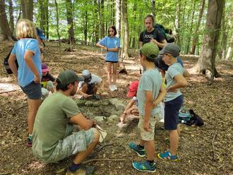 Dort begab man sich auf Spurensuche und entdeckte Spuren von Wildschwein und Co. Auch wurde ein tierisches Skelett gefunden. Hierbei handelte es sich um Teile einer Wildschweinwirbelsäule. Für den im Wald lebenden Gnom Frido wurde ein Unterschlupf gebaut, es wurden Bewegungsspiele gespielt, gewandert und die Natur genossen. Die zweite Gruppe verbrachte den Tag auf dem Hof gemeinsam mit Lothar Wilhelm von Waldwerken. Um Werkstücke aus Holz herstellen zu können, fällten die Kinder zunächst eigens einen Baum. Im Laufe des Tages entstanden Werkstücke in Form von Blumenvase, Flaschenöffner und Hammer. Auch an diesem Abend wurde gemeinsam gekocht und die Kinder bereiteten zur Stärkung ein leckeres Chili con Carne zu.