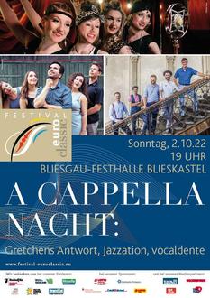 Gretchens Antwort: Als reine A Cappella-Frauenband interpretieren die vier jungen, modernen und selbstbewussten fearless females von „Gretchens Antwort“ nicht nur Klassiker der 20er bis 50er Jahre komplett neu – sondern arrangieren umgekehrt auch zeitgenössische Lieder unterschiedlichster Genres im cool swingenden Retro-Stil. Als mondäne DJanes mixen sie Swing und Rap, Charleston und Pop, Jazz und Rock mit betörendem Gesang und weiblichem Esprit und bringen das Grammophon damit so richtig zum Glühen… Das Publikum schätzt neben dem klaren Gesang vor allem die humorigen Schauspieleinlagen und die Ideen der vier Powerfrauen, mit denen sie modernen Songs im Stile von gestern zu einem frischen und heutigen Anstrich verhelfen.