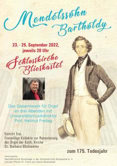 Vom 23. bis 25. September jeweils um 20 Uhr erklingen auf der Orgel der Blieskasteler Schlosskirche sämtliche Kompositionen für Orgel von Felix Mendelssohn-Bartholdy, u.a. die 6 Sonaten für Orgel op. 45, die zum Grundrepertoire eines jeden Organisten gehören. Helmut Freitag, Universitätsmusikdirektor der Hochschule des Saarlandes wird dieses eindrucksvolle Werk Mendelssohns wird an drei Abenden auf der frisch restaurierten Orgel zu Gehör bringen.
