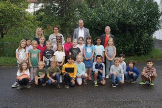 Die Schulneulinge an der Grundschule am Würzbacher Weiher mit (hintere Reihe von rechts) ihrer Klassenlehrerin Bianca Fries, Bürgermeister Bernd Hertzler, Schulleiterin Heidrun Bubeck-Wolf und Christina Zäh vom Sachgebiet Schulwesen der Stadt Blieskastel. (Foto: Uwe Brengel)