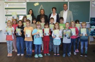Die „Tigerklasse“ mit ihrer Lehrerin Nadine Schang (hintere Reihe, 2. von rechts) freute sich über das Buch zum „Lesen lernen mit Bildern“, das ihnen der Bürgermeister und die städtischen Mitarbeiterinnen (von links) Stefanie Müller und Cornelia Gölzer vom Schulverwaltungsamt mitgebracht hatten.