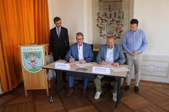 Die Bürgermeister von Bexbach und Blieskastel unterzeichnen einen Vertrag zur interkommunalen Zusammenarbeit. Von links: Jens Welsch, Bürgermeister Bernd Hertzler, Bürgermeister Christian Prech, Benjamin Schappe.