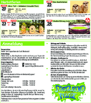 Das Anmeldeformular für die einzelnen Veranstaltungen finden Sie auf der Homepage der Stadt Blieskastel unter der Rubrik Jugend.