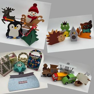 Mit Schablonen aus Plastik werden aus Karton, Tonpapier und Design-Elementen kleine Schachteln, Boxen und vieles mehr hergestellt.