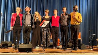 Mit seiner „musikalischen Entdeckung Osteuropas“ erfüllte das Ensemble „Halva“ perfekt das Motto des diesjährigen Festivals Euroclassic: Ostwind. Die sechs Musiker und Musikerinnen aus Belgien, Israel, England und Deutschland verzauberten das Publikum in der Festhalle Blieskastel mit ihrer Mischung aus jiddischer Klezmermusik und Kompositionen aus Bulgarien, Rumänien, Griechenland sowie dem Nahen Osten. Schon lange beschäftigt sich der Kopf der Gruppe, Nicolaas Cottenie mit den Tänzen, Rhythmen dieser Regionen. Charmant gab er Informationen zu den einzelnen Stücken, die keine simple Wiederholung überlieferter Werke sind, sondern aus seiner kompositorischen Feder zu kleinen Gesamtkunstwerken zusammenfließen. Mit „Frühstück in Kiew“ wurde bewusst, dass die jiddische Tradition bis in die Ukraine reichte. Oft wird das Tänzerische durchwoben von einer zarten Melancholie, die die Klarinettistin Susie Evans virtuos zum Schwingen brachte. Dazu gesellten sich oft unisono die Violinen, im perfekten Zusammenspiel von Cottenie und Alina Bauer. Egal, aus welchem Land die Stücke kamen, - an den Skalen, den melismatischen Melodien, den Rhythmen konnte man die gemeinsamen musikalischen Wurzeln dieser inspirierenden und faszinierenden Musik erkennen. So zum Beispiel beim „Kaffee in Beirut“, den der Tausendsassa Robbe Kieckens an Tambourin, Trommel und Djembé mit flinken Fingern und einer unglaublichen rhythmischen Finesse „versüßte“, wie natürlich alle anderen Stücke auch. Eline Duerinck am Cello und Ira Shiran am Akkordeon vervollständigten die Rhythmusgruppe, nicht ohne in eigenen Soli glänzen zu können. Das „Dinner in Sofia“ vervollständigte das musikalische Menü, ehe sich der Vorhang für Emanuela Mandrila öffnete, eine aus der Bukowina stammende Sängerin, die mit ihrer temperamentvollen Art das Publikum sofort für sich einnahm. Sie sang von Sehnsucht, Liebe, im Meer verschwundenen Männern, egal, ob auf Griechisch oder Rumänisch: die menschlichen Dramen und Empfindungen scheinen überall gleich. Mit ihrer einschmeichelnden Stimme mischte „Emma“ sich perfekt mit den Instrumenten, für die Nicolaas Cottenie abwechslungsreiche Arrangements komponiert hat. Das begeisterte Publikum entließ die so inspiriert und leidenschaftlich aufspielenden Musiker und Musikerinnen nicht, ohne zwei Zugaben erklatscht zu haben.