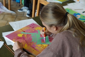 Nachdem die Grundlagen besprochen waren, entwarfen die Jugendlichen auf Basis eines eigenen Tags ihre individuellen Styles. Diese wurden zunächst auf Papier festgehalten und weiterentwickelt. Im nächsten Schritt ging es an die praktische Umsetzung: Jeder Teilnehmer erhielt eine Leinwand im A3-Format, die zuerst mit Spraydosen gestaltet wurde. Ein passender Hintergrund wurde gesprüht, um den späteren Schriftzug in Szene zu setzen.
