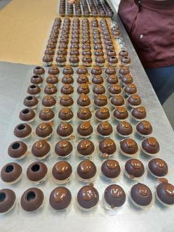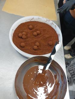 Besonderes Highlight war das Füllen der Pralinenrohlinge mit einer aromatischen Tonkabohnen-Ganache. Nach einer Abkühlpause im Kühlschrank wurden die Pralinen verschlossen, mit Schokolade überzogen und abschließend in feinem Kakao gewälzt.