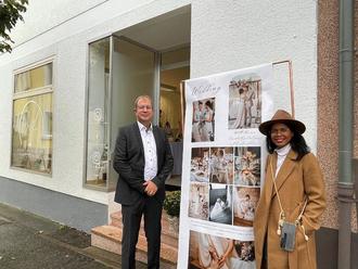 Penélope Ratsch mit Bürgermeister Bernd Hertzler vor den Geschäftsräumen des Fotoateliers in der Parkstraße. (Foto: privat)