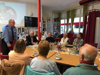 Bildunterschrift: Polizei-Oberkommissar Thomas Clemenz (links stehend) und Guido Freidinger, der u. a. für die städtischen Senioren zuständige Beigeordnete (2. von links), begrüßen die Gäste.
