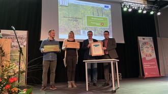 Verantwortlich an der Schule und besonders engagiert sind die Lehrkräfte Johannes Schmitt und Miriam Albert (beide links). Gemeinsam mit Schulleiter Dirk Kleemann(rechts) nehmen sie ihre Urkunde und Schilder "Biosphärenschule" vom stellvertretenden Verbandsvorsteher Frank John (Mitte) offiziell entgegen.