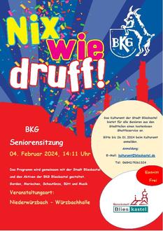 Hinweis: Das Kulturamt der Stadt Blieskastel bietet für die Seniorensitzung der BKG am 04.02.2024 einen kostenlosen Shuttle-Service mit Großraum-Taxis an. Hierfür müssen Sie sich jedoch im Vorfeld bei der Tourist-Info unter der Telefon-Nr.: 06842-926-1314 anmelden.