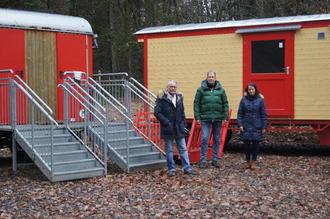 Bürgermeister Bernd Hertzler (Mitte) besuchte gemeinsam mit dem Beigeordneten Guido Freidinger und Gabriela Jung vom zuständigen Fachgebiet den Waldkindergarten. Rechts im Hintergrund der neue Bauwagen. (Foto: Uwe Brengel)