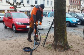 Den Paradeplatz umgeben bekanntlich vierundzwanzig Kopf-Platanen. In der Vergangenheit hatte bereits ein Pilzbefall dazu geführt, dass Bäume ersetzt werden mussten. Eine wichtige Voraussetzung zum Erhalt und gesunden Wachstum ist es daher, die richtigen Voraussetzungen für das Wurzelwerk zu schaffen. Aufgrund der am Standort vorhandenen Bodenverdichtung und Staunässe wurde am 5. Dezember eine Bodenbelüftung durch einen Fachbetrieb durchgeführt. Bei diesem standardisierten Verfahren werden mittels einer Druckluft-Lanze um die Baumscheibe herum mehrere Löcher hergestellt und anschließend mit einem sogenannten Bodenhilfsstoff (Terramol plus Dünger) befüllt. Das trägt zur Verbesserung der Sauerstoffversorgung im Erdreich sowie zur Optimierung der Nährstoffversorgung bei, darüber hinaus wird der Bildung von Staunässe und Wurzelfäulnis vorgebeugt. Ein nachhaltiges Verfahren, das die Langlebigkeit der Bäume entsprechend fördern soll.