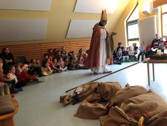In der Kita Peppenkum war die Vorfreude groß, denn der Nikolaus hatte seinen Besuch angekündigt! Am 6. Dezember versammelten sich alle Kinder im Turnraum, sogar die Kinder, die die Dependance in Altheim besuchen, waren extra für diesen Tag nach Peppenkum gekommen. Die Rolle des Bischof Nikolaus übernahm Diakon Steffen Dully, der mit viel Geschick, die Kinder in seinen Bann zog und sofort die Herzen der Kinder eroberte.
