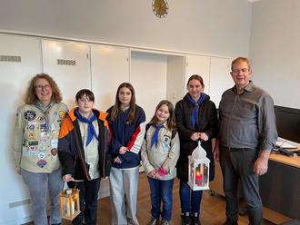 Sie brachten das Friedenslicht zu Bürgermeister Bernd Hertzler ins Rathaus (von links): Susanne Geisinger, Ben Rastetter, Emily Alicia Theis, Sophie Schmid und Lena Bauer.