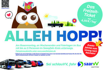 Am Rosenmontag kann zudem das Freizeitticket im Bus erworben werden. Damit können bis zu 5 Personen im Bus im Saarpfalz-Kreis und in der Gemeinde Kleinblittersdorf für nur 6,50 € besonders günstig unterwegs sein. Das Ticket gilt nur im Bus, nicht im Schienenverkehr und nicht in Bussen von Saarbahn und NVG.