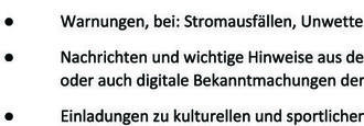 Bei der Anmeldung können Sie festlegen, welche Art von Informationen Sie erhalten möchten (z. B. Kultur, Familie, Nachrichten aus dem Rathaus oder anderer Ortsteile). Wir empfehlen Ihnen, Ihre Telefonnummer und Wohnort anzugeben, damit wir Sie bei unerwarteten Ereignissen (z. B. Hochwasser, Sperrungen oder Unfällen) schnell alarmieren können.