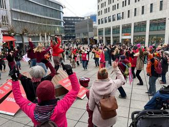 Menschen weltweit demonstrieren tanzend gegen Gewalt an Mädchen und Frauen für Wertschätzung, Selbstbestimmung und Gerechtigkeit.