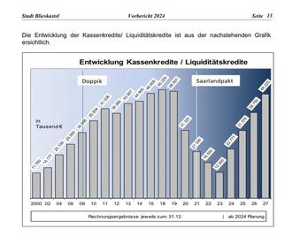 Die Grafik zeigt die Entwicklung der städtischen Kassenkredite und wurde aus dem Vorbericht zum Haushalt 2024 entnommen.