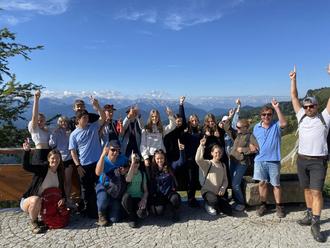 Gruppenfoto mit Alpenpanorama - auf dem Brauneck vor dem Besuch der Bergkäserei Stie-Alm