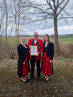 Musikverein Döngesmühle ernannt. Elisa Harengel und Tamara Reuß überreichten dem Jubilar die Ehrenurkunde.