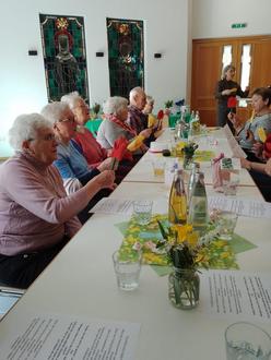 Am Palmsonntag, den 13.4.2025 traf sich die Seniorenrunde wieder im Pfarrheim. Der Palmsonntag erinnert an den Einzug Jesu in Jerusalem, mit dem sein Leidensweg begann. Ausgewählte Texte verdeutlichten uns die Bedeutung der Heiligen Woche. Außerdem hörten wir die biblische Geschichte über Lazarus von Bethanien. Nach Kaffee und Kuchen gab es noch ein geselliges Beisammensein mit Bewegungstanz und Osterrätsel.