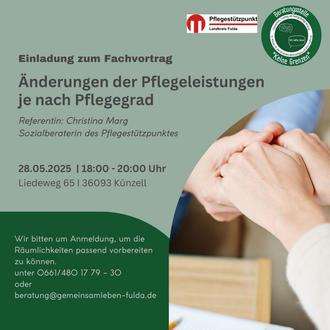 Mit einem Pflegegrad können Betroffene und deren Angehörige entlastet werden. Doch wem steht so ein Pflegegrad zu und wie bekomme ich den? Und was für Leistungen gibt es denn mit einem Pflegegrad? All diese Fragen werden bei dem Vortrag beantwortet. Darüber hinaus gab/ gibt es dieses Jahr wichtige Anpassungen bei den Pflegeleistungen, die viele Betroffene und Angehörige finanziell entlasten sollen. Insbesondere wurden die Leistungen in mehreren Bereichen erhöht, um den gestiegenen Kosten in der Pflege gerecht zu werden. Eine besonders bedeutende Neuerung ist das sogenannte Entlastungsbudget, das ab dem 1. Juli 2025 in Kraft tritt. Es soll pflegende Angehörige gezielter unterstützen und flexiblere Nutzungsmöglichkeiten für bestehende Leistungen schaffen. Auch diese Änderungen sind Inhalt des Abends.