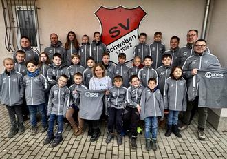 Das Trainer- und Betreuerteam freut sich mit den Juniorenspielern über dreißig neue Regenjacken für die E-Junioren-Teams der JSG Flieden/Schweben, die von Frau Elena Jakobson, der Geschäftsführerin der Firma MIDAS „Pool Products“ in Neuhof-Dorfborn, an der Weihnachtsfeier überreicht wurden. Daher von uns ein herzliches Dankeschön an Frau Jakobson für die Unterstützung der Jugendspielgemeinschaft Flieden/Schweben.