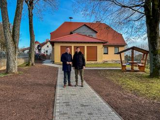 Bürgermeister Christopher Gärtner und Sascha Rumpeltes vom Bauamt der Gemeinde Flieden freuen sich über die Fertigstellung des barrierefreien Zugangs zum DGH Buchenrod.