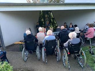Bei wunderbarem Frühlingswetter feierten wir eine Maiandacht im Garten des Seniorenheims St. Katharina. Vor der Marienstatue waren Bänke und Stühle für die Heimbewohnerinnen und -bewohner und zahlreiche Gäste bereitgestellt worden.