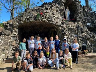 Am 28.4. besuchten wir (die Klasse 4 der Steinkammerschule) mit unserer Religionslehrerin Frau Kempel die Mariengrotte in Rückers.