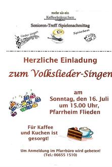 Alle, ob jung oder alt, die Lust am Singen haben, sind herzlich zum Volksliedersingen und zum Kaffeetrinken ins Pfarrheim eingeladen. Bitte um vorherige Anmeldung unter 1510.