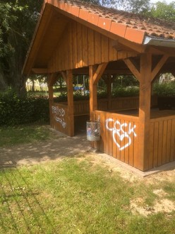 Der Spielplatz in Döngesmühle mit der Unterstellhütte ist ein beliebter Ort für Familien mit Kindern. Er wird gerne von Kindergärten sowie Schulklassen besucht. Umso trauriger ist es, dass diese Unterstellhütte am vergangenen Wochenende zwischen Freitag, dem 07.07.2023 und Samstag, dem 08.07.2023 Bestandteil einer Sachbeschädigung wurde. Bisher unbekannte Personen haben die Unterstellhütte außen, sowie innen die Bänke und Tische mit Farbe besprüht.