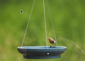 Die Fotos zeigen beispielhaft eine hängende und eine höherstehende Wasserschale. Beide sollen katzensicher aufgestellt/aufgehängt werden, damit die Vögel bei nahender Gefahr diese erkennen und rechtzeitig fliehen können.