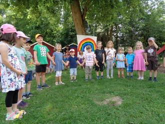 Mit den Kindern der Sonnengruppe malten wir einen bunten Regenbogen in Form eines Tanzes.